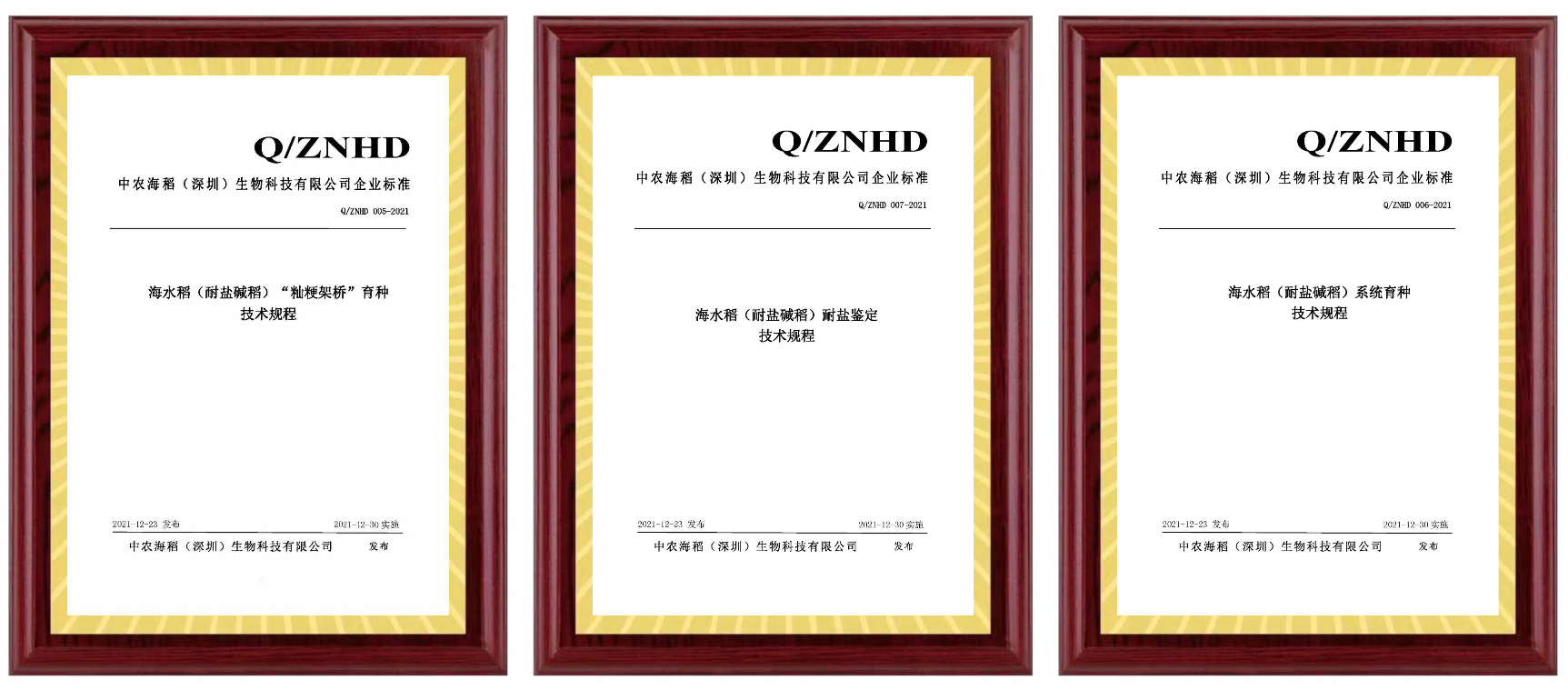 ? 2021年12月23日,由中農(nóng)海稻(深圳)生物科技有限公司起草的海水稻(耐鹽堿稻)“秈粳架橋”育種技術(shù)規(guī)程(Q/ZNHD 005-2021)、海水稻(耐鹽堿稻)育種技術(shù)規(guī)程(Q/ZNHD 006-2021)、海水稻(耐鹽堿稻)耐鹽鑒定技術(shù)規(guī)程(Q/ZNHD 007-2021)三個企業(yè)標(biāo)準(zhǔn)正式發(fā)布。
